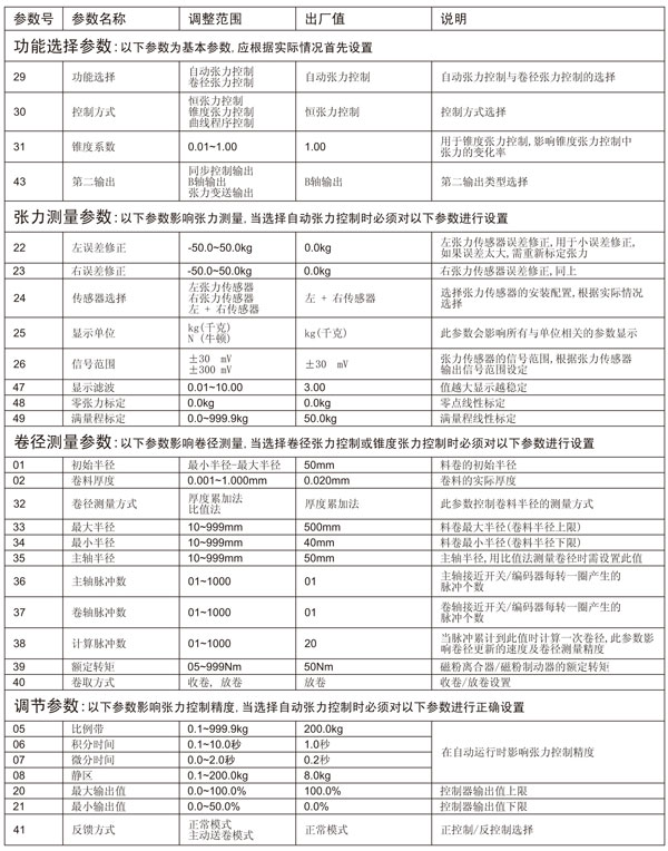 為了使控制器能正確測量卷料張力,必須對與張力測量相關(guān)的參數(shù)進行正確的設(shè)置: